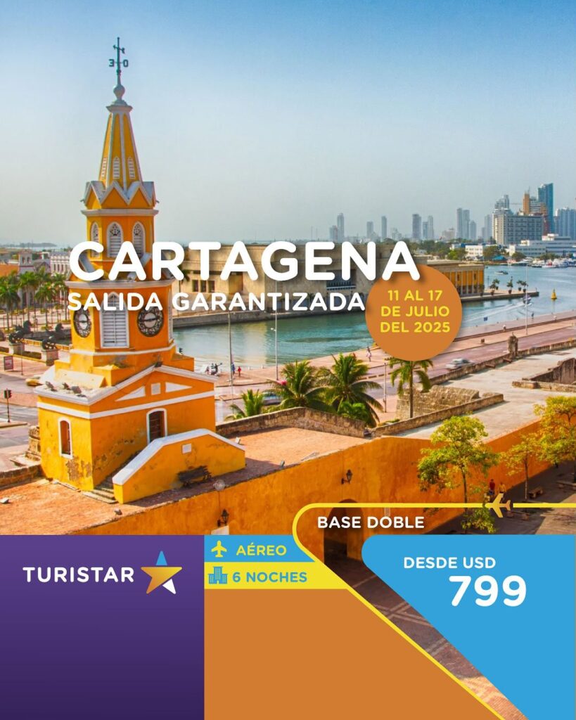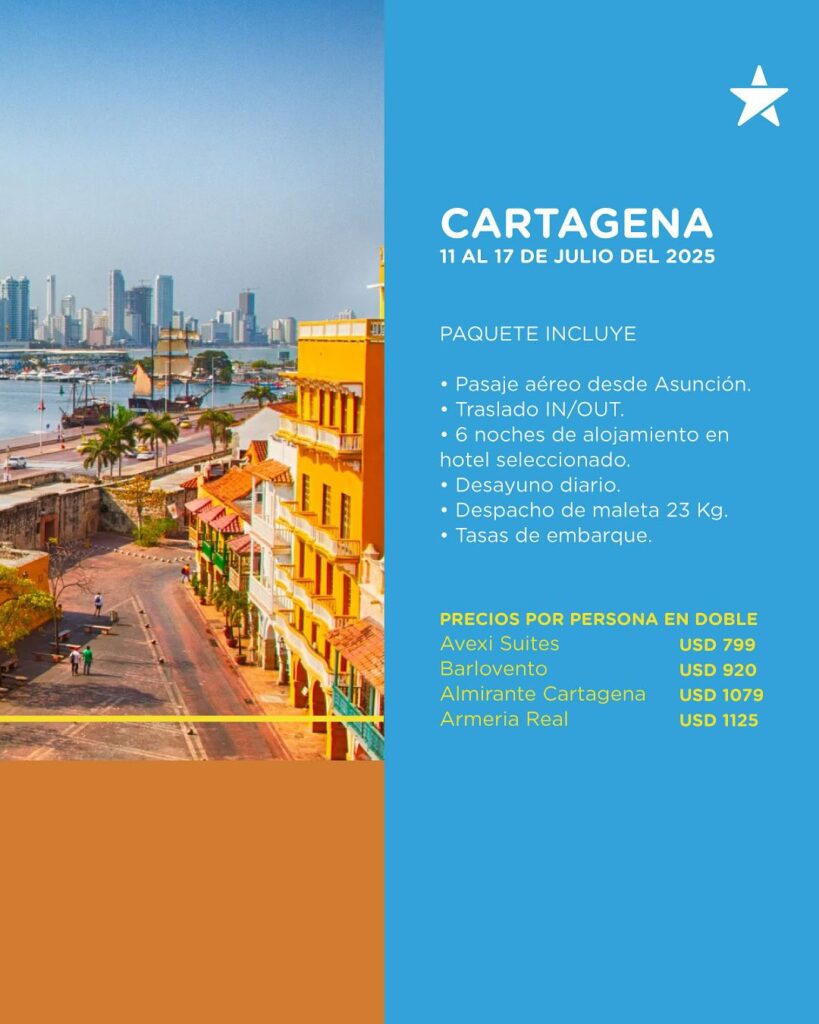 Vive el encanto de Cartagena de Indias con nuestro paquete especial. Salida garantizada el 11 de julio de 2025 desde Asunción. Incluye pasaje aéreo, traslados, 6 noches de alojamiento con desayuno, maleta de 23 kg y tasas de embarque. ¡Tu viaje soñado al Caribe colombiano comienza aquí!