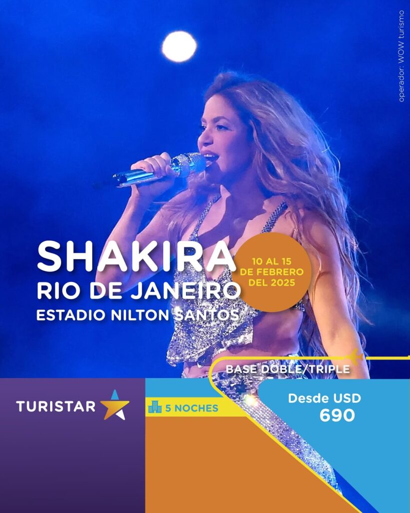 “Disfruta de una experiencia inolvidable en Río de Janeiro con nuestro paquete exclusivo para el concierto de Shakira el 11 de febrero de 2025. Incluye 5 noches de alojamiento, desayuno diario, entrada al evento y traslado grupal hotel-evento-hotel. ¡Vive la magia de Shakira en vivo! *No incluye pasaje aéreo.”